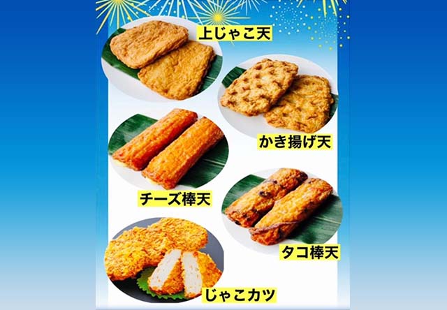 お好み焼き、焼きそば、フランクフルト、しゃかしゃかフライドポテト、揚げたこ焼き、チーズスティック、鶏皮ぎょうざ