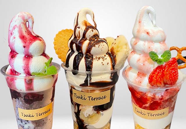 ソフトクリーム類、パフェ類、削りいちご、チュロス、ベルギーワッフル、クリームフラッペ、ソフトドリンク